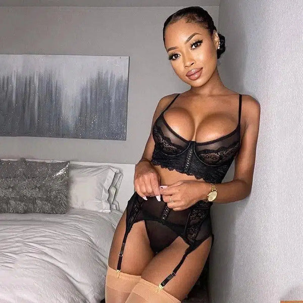 产品描述:女士蕾丝睫毛拼接吊带内衣三件套