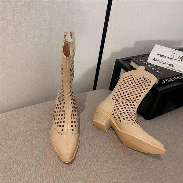 尖头西部牛仔靴 女式薄型中空骑士厚底靴