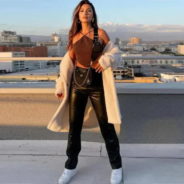 弹力皮裤 女式休闲 PU 皮裤 长裤
