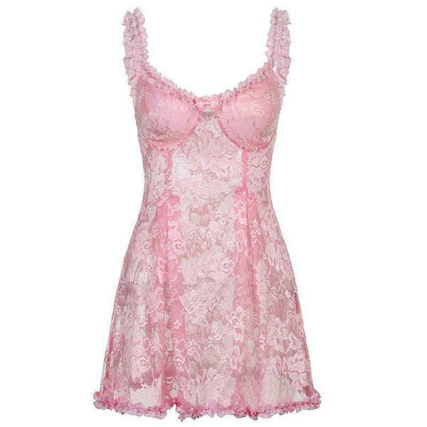产品描述:蕾丝透视花边吊带连衣裙(V 领)