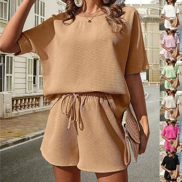 新款华夫格套装女式蝙蝠袖短袖圆领上衣和抽绳设计短裤时尚两件套夏季服装