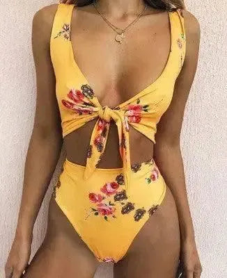 樱桃印花蕾丝比基尼开叉泳装