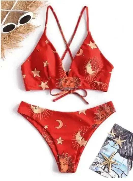日月星印花高腰开叉比基尼