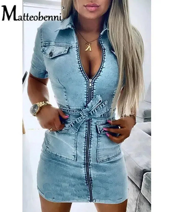 牛仔连衣裙 拉链休闲 V 字领