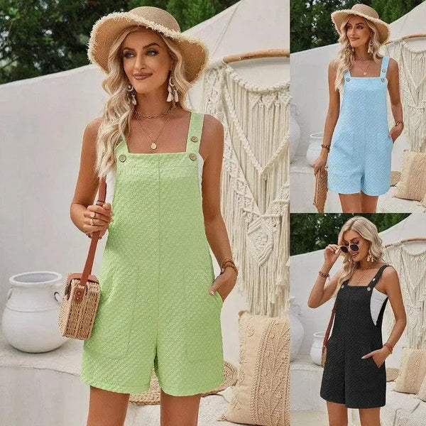 甜美华夫格连体服 女童夏季无袖纽扣设计直筒纯色连体服 时尚女装