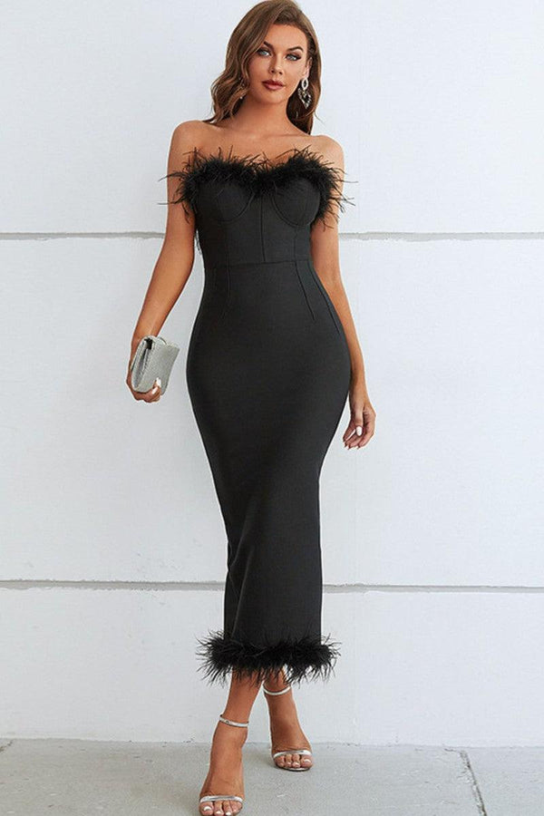 羽毛 装饰 无肩带 心形 领口 连衣裙