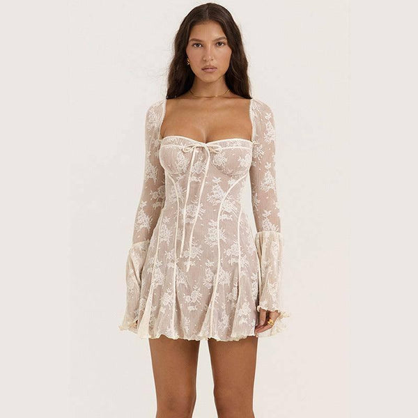 蕾丝方领连衣裙 喇叭裤长袖系带 A 字连衣裙 女式服装