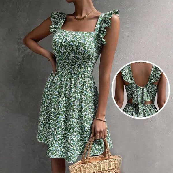 夏日方领荷叶边无袖连衣裙配蝴蝶结领带
