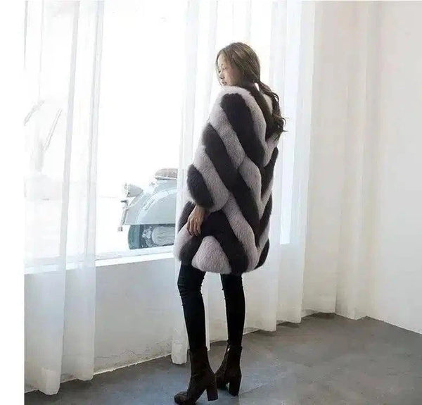 条纹长袖人造毛皮大衣