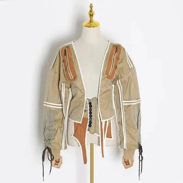 领口:敞开式前襟,肩部有结构性细节 - 版型:剪裁合身,具有现代轮廓和可调节元素