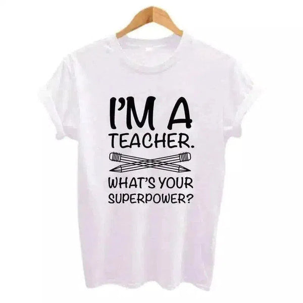 - 领口:圆领 版型:常规版型设计特色:正面印有 "I'm A TEACHER.文字下方配有两支交叉铅笔的图案。