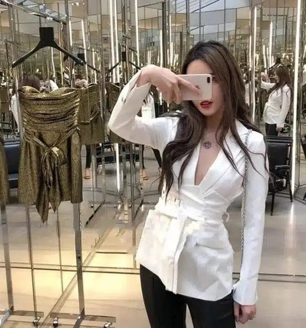 - 领口:V领 版型:剪裁合身,腰部系带细节