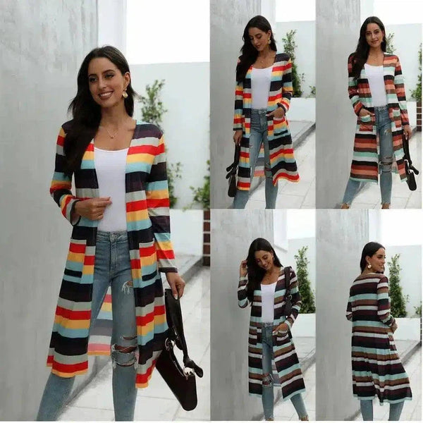 - 服装类型:长开衫袖长:长袖领口:前开襟,无开合版型:宽松版型设计:横向多色条纹