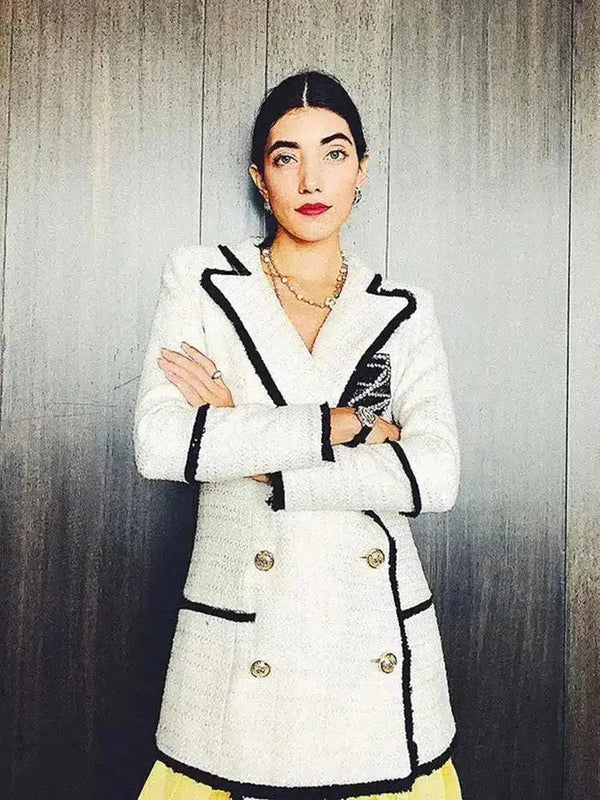 长度: 大腿中部长度 - 颜色:主要为米白色,配以对比鲜明的黑色饰边