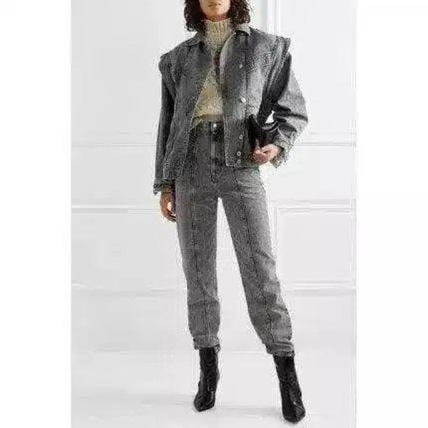 - 袖长:长袖 领口或肩部样式:夹克上的经典领版型:宽松夹克和直筒长裤弹力:看起来弹力很小