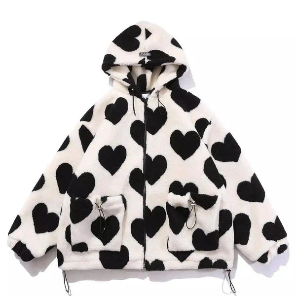 设计:乳白色背景上的黑色心形图案 - 口袋:两个前口袋,带抽绳开合