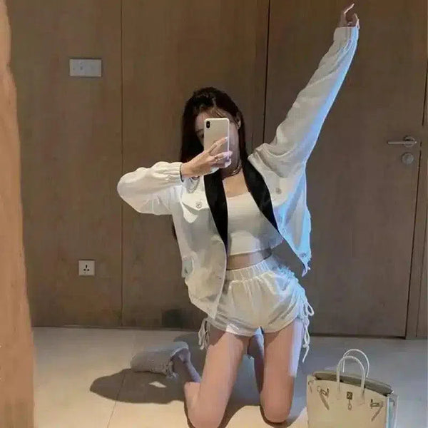 - 袖长:长袖 领口或肩部款式:领口设计,肩部宽松版型或弹性:短裤腰部可通过抽绳调节;外套宽松