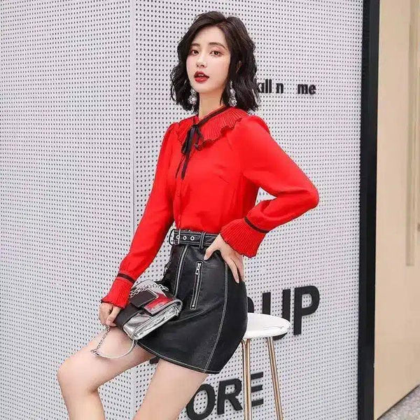 领口:经典领口,带系带细节 - 版型:剪裁合体,轮廓时尚
