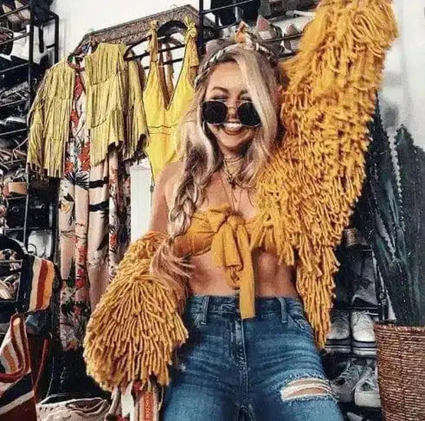 领口或肩部款式:前绑带露肩麦秆上衣 - 袖长:长袖,大量流苏细节