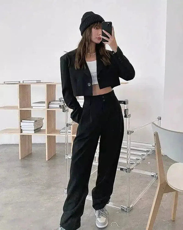 女式休闲西装外套和高腰长裤套装