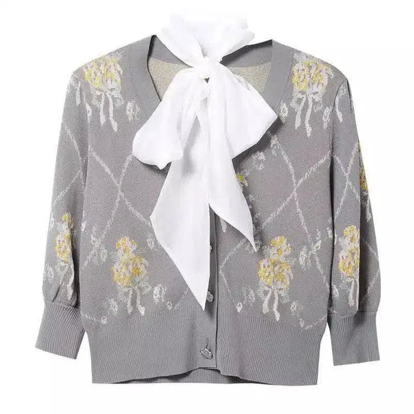 女式花朵开襟羊毛衫配蝴蝶结领带