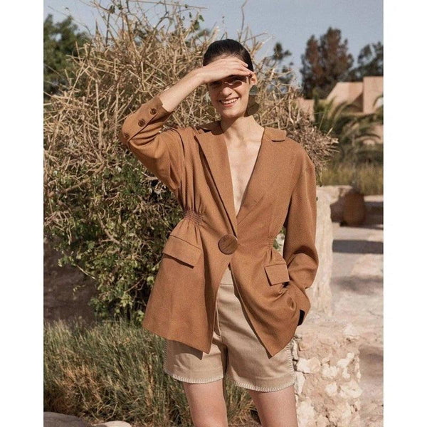 版型:剪裁合身,腰部收腰设计,勾勒出妩媚的轮廓 - 设计细节:彰显个性的纽扣开襟和前袋,功能性十足