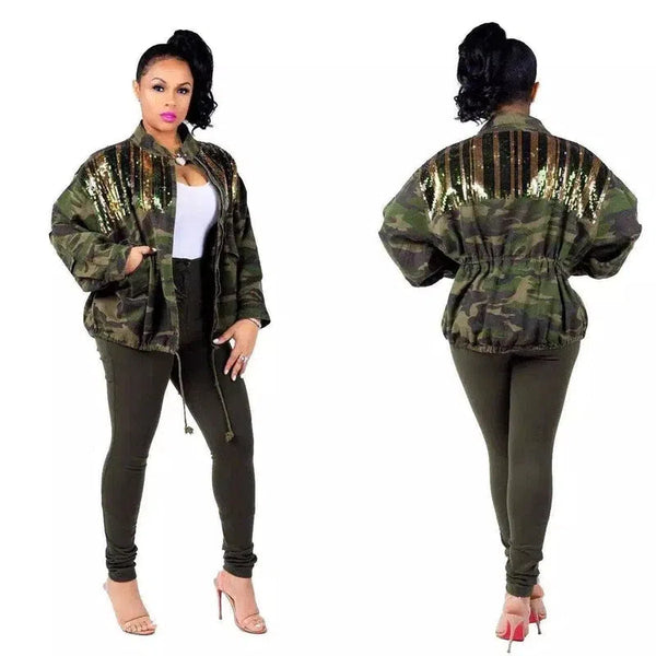- 服装类型:迷彩轰炸机夹克,亮片细节袖长:长袖领口或肩部款式:罗纹领版型或弹力:下摆松紧设计,腰部更贴身;宽松版型贯穿全身