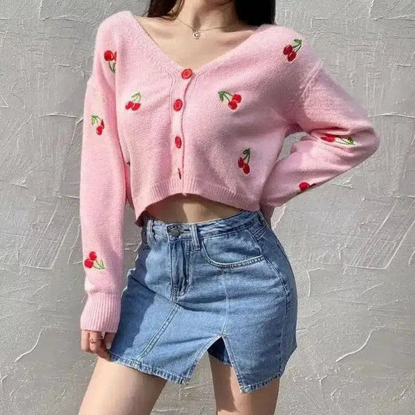 樱桃刺绣前襟纽扣开襟羊毛衫