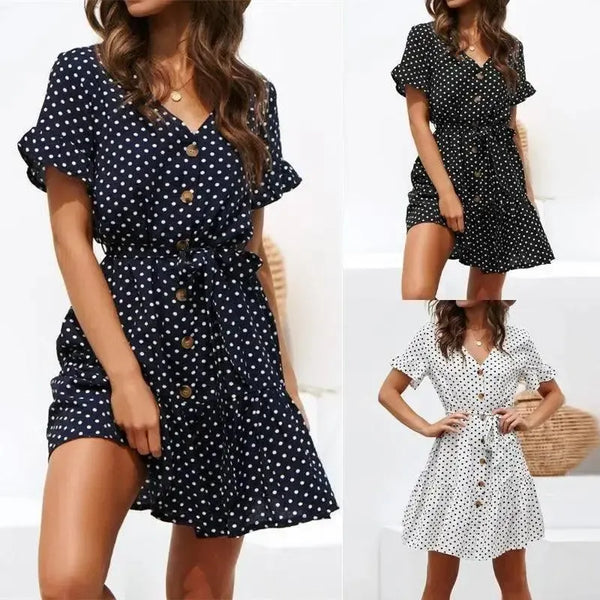 类型:女士连衣裙图案:圆点风格:休闲 领口: V领保养说明:建议手洗或干洗