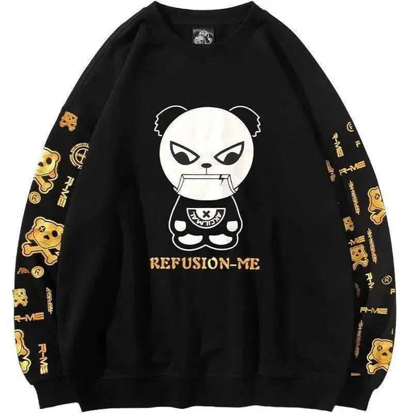 - 版型: 宽松版型 设计特点:大胆的熊猫图案,袖子上有俏皮的印花 颜色:黑色,白色和金色图案对比鲜明