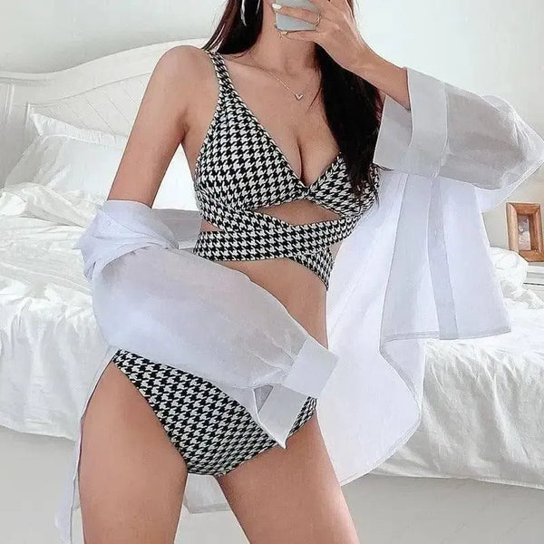 产品描述:猎犬纹交叉绑带泳装比基尼