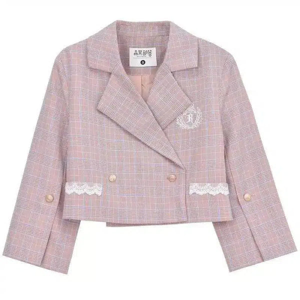 - 设计细节:双排扣,口袋蕾丝边装饰,格纹图案 配色方案:淡粉色与微妙的多色格纹搭配