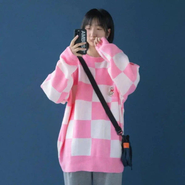 - Type of Garment:超大号毛衣 袖长:长袖 领口:圆领 Fit: 宽松版型 设计:俏皮的粉白格纹图案 细节:绣花字符装饰