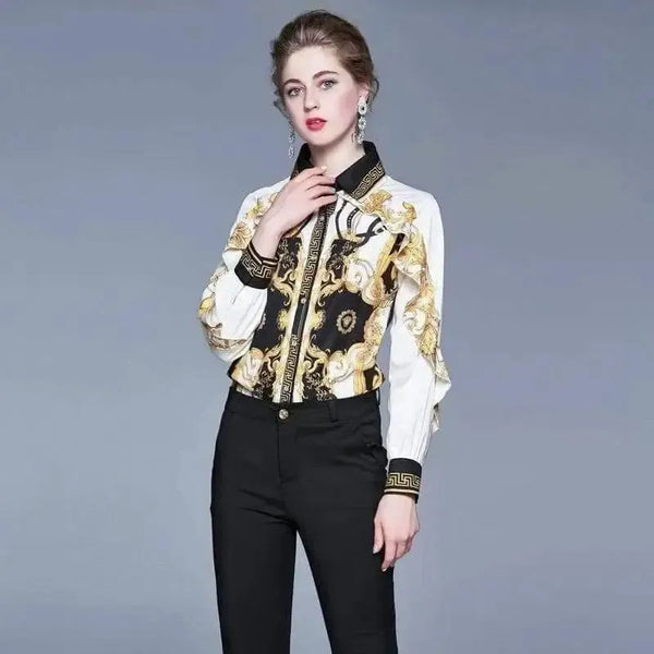 复古宫廷印花荷叶边修身时尚印花衬衫