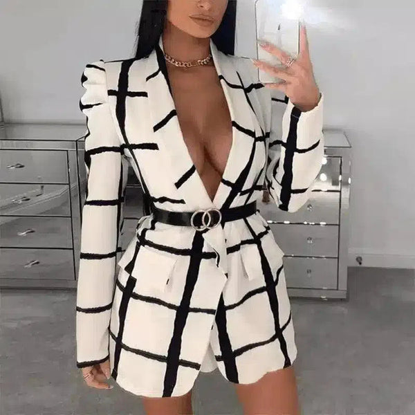 - 服装类型:女式西装连衣裙袖长:长袖领口:深 V 领版型: 贴身剪裁,配腰带