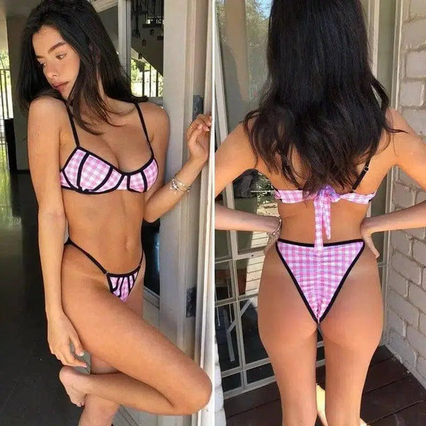格子印花吊带比基尼