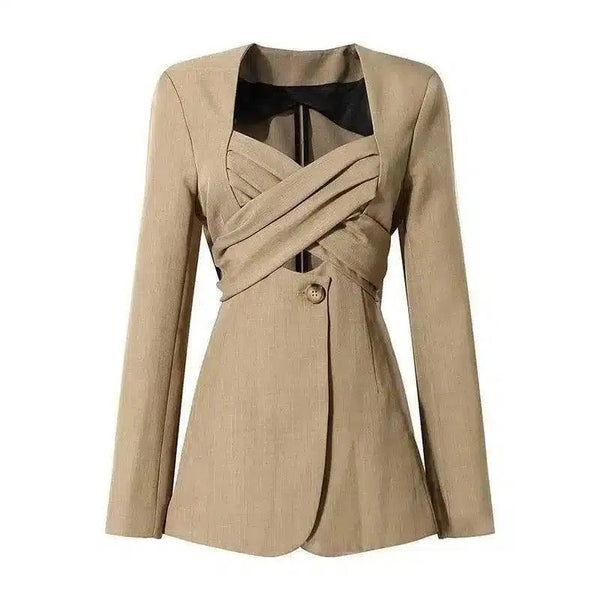- 服装类型:女式西装外套袖长:长袖领口或肩部款式:不对称交叉前领口剪裁或弹力: 剪裁合身,前襟纽扣开合