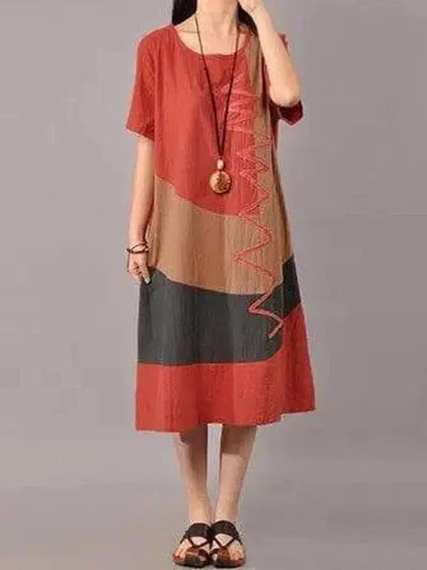 S-5XL 女士休闲短袖拼接宽松 O 领中长款