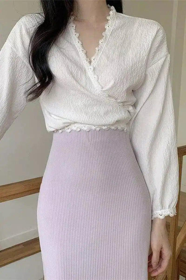 蕾丝边 V 领上衣搭配针织铅笔裙