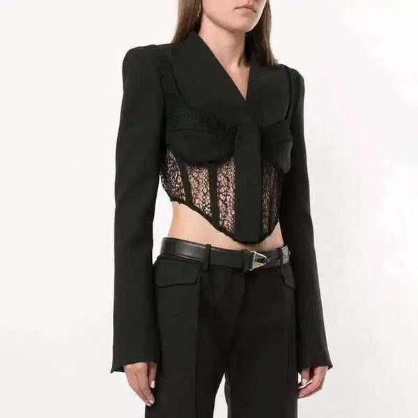 优雅的蕾丝装饰:这件西装外套展示了复杂的蕾丝花边,为整体设计增添了一丝女性魅力,非常适合那些欣赏精湛工艺的人。