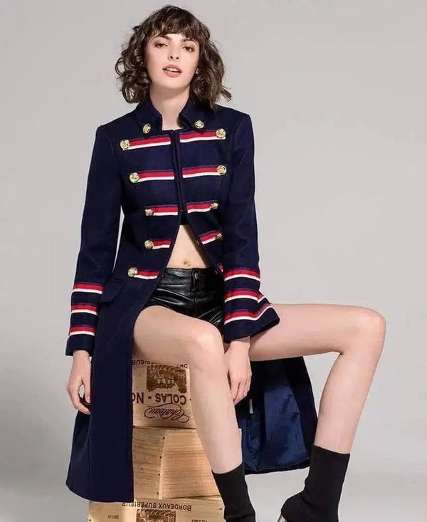 复古时尚条纹金属扣蓝色朋克/军装长款