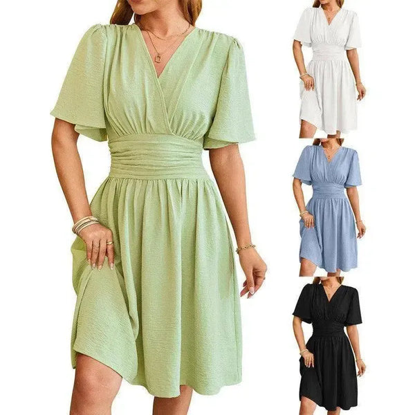 V 领短袖连衣裙 时尚喇叭袖连衣裙 夏季女装